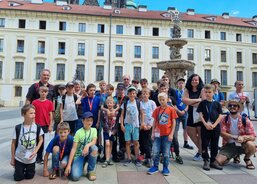 Prvním místem, které chlapci s doprovodem navštívili byl Pražský hrad vč. katedrály. „Měli jsme ideální počasí a pro vyhlídku na Prahu z věže katedrály jsme si nemohli přát nic lepšího.“ ukazuje u první z fotografií Václav Keprt. V rámci návštěvy hradu došlo také ke krátkému setkání se zástupkyní Nadačního fondu Miloše Zemana, jenž v květnu letošního roku přispěl na pomoc evakuovaného domova.