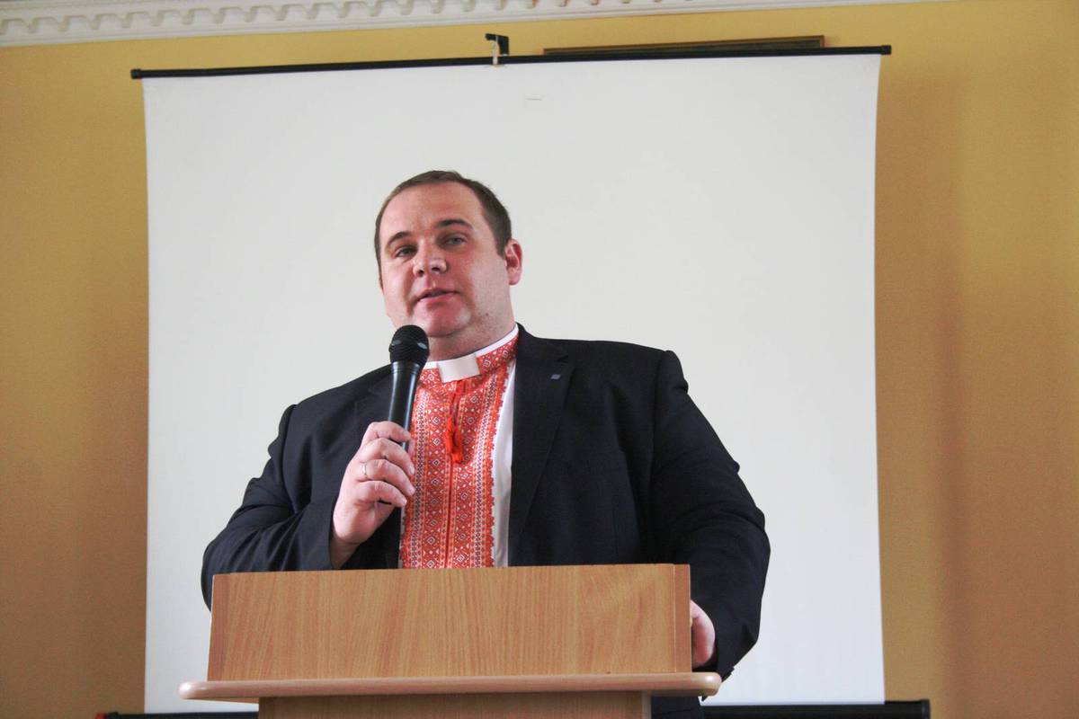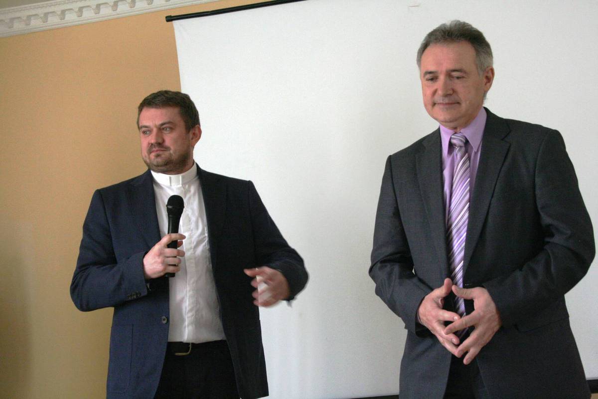 Projevy všeho druhu. Kromě biskupa se ujímají slova i šéf kolomyjské Charity Serhij Tryfjak či ředitel ACHO Václav Keprt, děvčata a další…